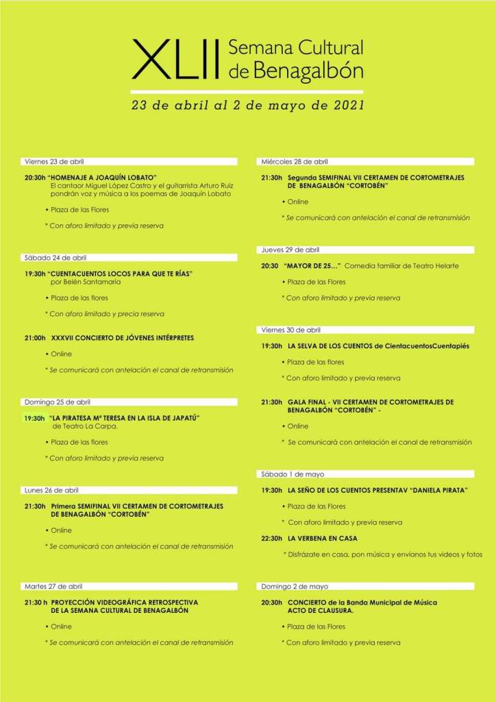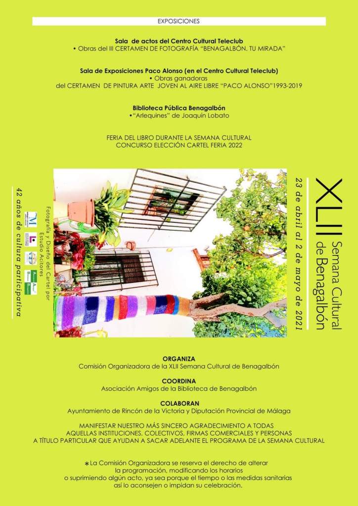 Durante la semana, del 23 de abril al 2 de mayo, se celebrarán actividades musicales como el XXXVII Concierto de jóvenes intérpretes (online), la actuación de la Banda de Música en la Plaza de las Flores, cuentacuentos, teatro con `Mayores de 25…´ comedia familiar a cargo de Teatro Helarte, `La piratesa de María Teresa en la Isla de Japatú´ de Teatro La Carpa, y exposiciones con obras del III Certamen de Fotografía `Benagalbón, tu Mirada´ en la Salón de actos del Centro Cultural Teleclub con un total de 42 fotografías sobre Benagalbón y 58 de Málaga y provincia. La Sala Paco Alonso expondrá las obras ganadoras del Certamen de Pintura Arte Joven al Aire Libre `Paco Alonso 1993-2019´, y `Arlequines´ de Joaquín Lobato en la Biblioteca de Benagalbón.